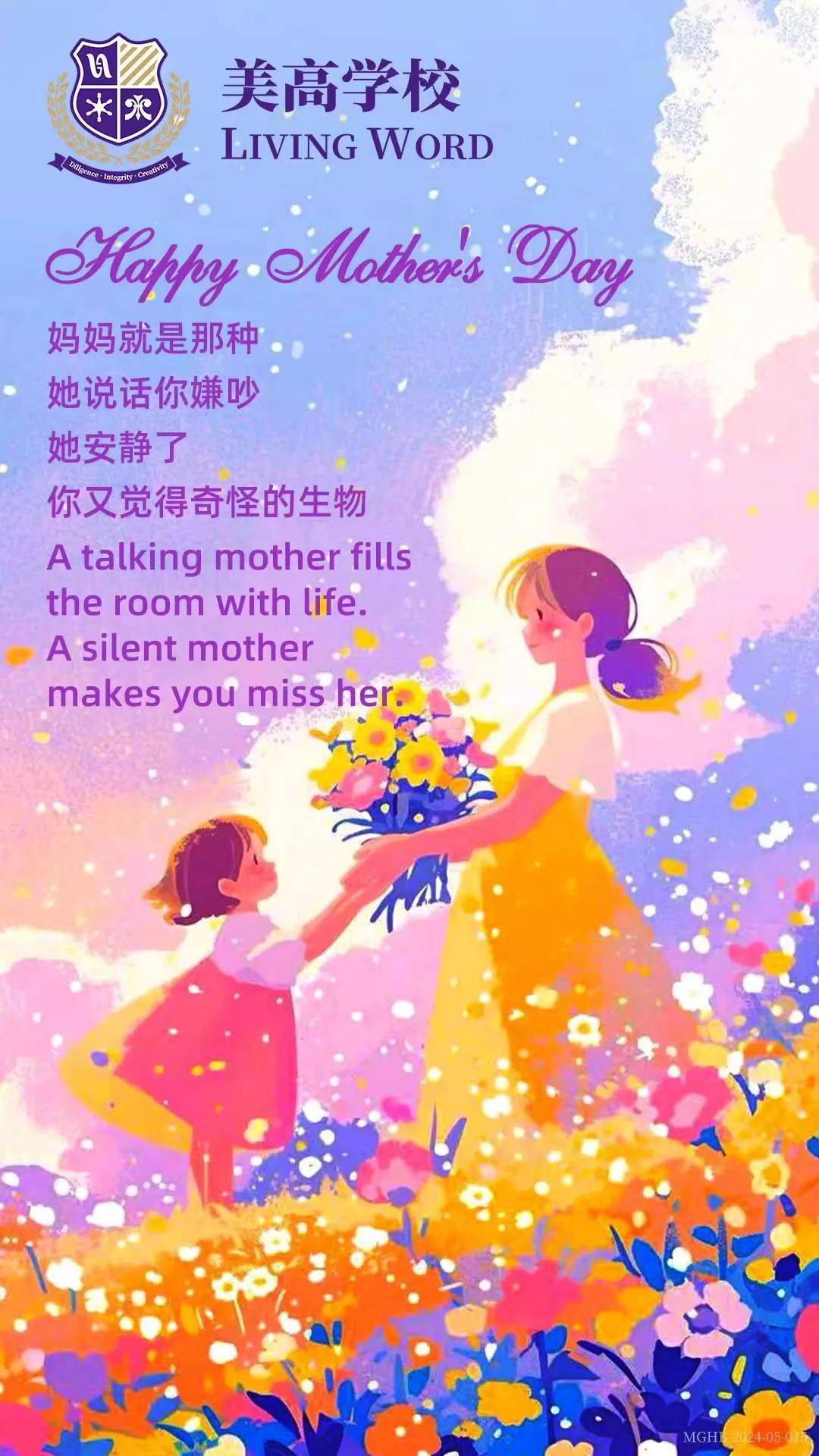 感恩教育一直是美高双语学校所注重的德育教育。旨在培养学生们爱亲人、爱社会的情感。在母亲节来临之际,美高双语学校开展了“母亲节”主题教育活动。活动以“致敬,伟大的母亲!”为主题,让孩子们了解母亲的工作、爱好及艰辛,帮助妈妈做力所能及的事来感恩母亲。
