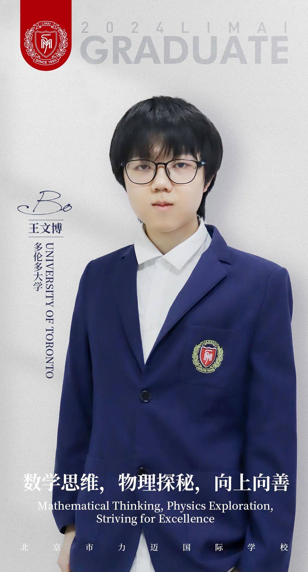 外方教学主管Mr. Matthew:“The baby Hermes of our class, Bo’s ingenious intensity and humor have been critical to the development of C12’s remarkable class culture. Able to turn his intellectual energy on a dime, Bo has always provided trenchant insights hedged in cryptic delivery regardless of the subject of study, and his confidence is ever infectious. One must also note of this daring ephebos that few romances have painted as vivid a picture of love as that which obtains between Wang Wenbo and the study of mathematics. It is his singular devotion, and his loyalty and adherence to it promises extraordinary prospects for the young man.Our hope for Bo is that he holds true to his deep and abiding interest in mathematics, finding a way to couple his research in the field with the alacrity he demonstrated for social inquiry in our program. The world awaits what Bo is capable of! ”