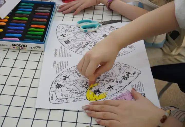 最后,同学们还在现场来了一次大脑的“DIY”,按照额叶、颞叶、枕叶、辨别时间、威尼克皮质区、运动前区等不同功能和分区涂色,最后经过裁剪完成一个立体的大脑模型。