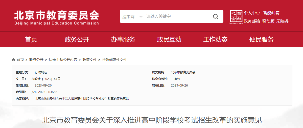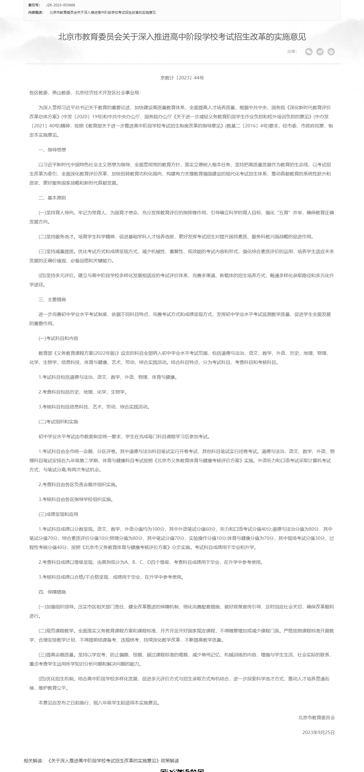 9月26日,北京市教委发布了《关于深入推进高中阶段学校考试招生改革的实施意见》,《意见》指出北京市将从2024年起进一步完善初中学业水平考试制度,依据不同科目特点,完善考试方式和成绩呈现方式,教育部《义务教育课程方案(2022年版)》设定的科目全部纳入初中学业水平考试范围,包括道德与法治、语文、数学、外语、历史、地理、物理、化学、生物学、信息科技、体育与健康、艺术、劳动、综合实践活动。结合科目特点,分为考试科目、考查科目和考核科目。其中道德与法治、语文、数学、外语、物理、体育与健康为考试科目,考试成绩可用于毕业和升学。