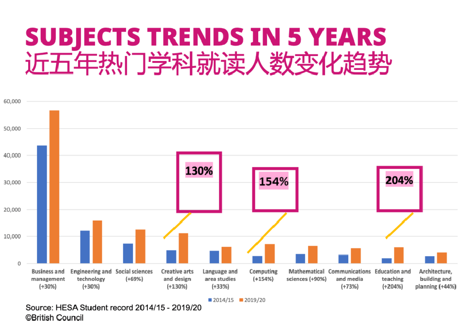 现在许多家长选择艺术升学已经不再是被迫选择,而是打破传统误区之后的主动选择。有数据统计,2014-2019年艺术与设计类申请人数增长130%,虽然2020-2022略有减少,但是2023申请季人数已经回流,艺术与设计类提交共271,600份申请,另外2023年,艺术与设计类成为英国申请第二大热门学科,仅次于商科类专业。