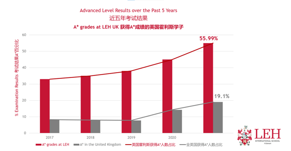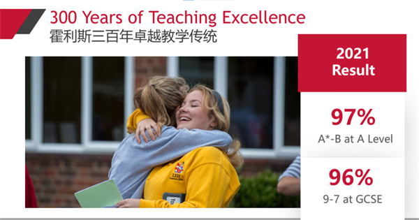 在2021年,英国LEH学校有97%学生在A level考试中获得A*-B,96%在GCSE考试中获得A*-A(9-7),90%学生如愿以偿到自己的第 一志愿大学深造。佛山霍利斯的目标是对标英国姐妹学校的教学水平和成绩。
