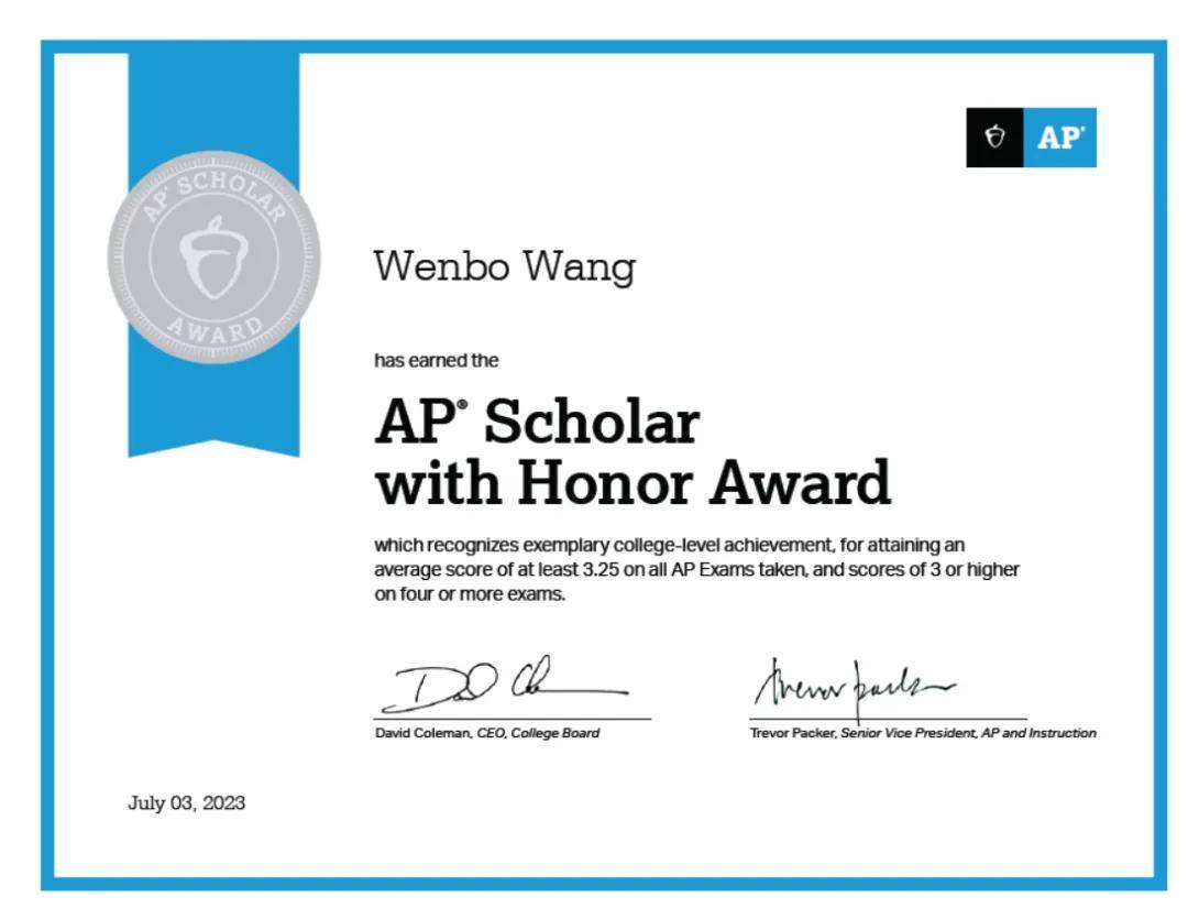 升学指导张老师:“文博同学的成长经历 充分展现了他在学术上的踏实和自律,以及对自我提升的不懈追求。其实从初中开始,他就展现出对数学的浓厚兴趣和强烈的自学能力,所以他也在标化考试中取得了非常理想的分数。正是这种自我驱动力才能帮助他在学业上表现出色并最终顺利收获理想大学录取。在申请季期间,文博展现出了出色的时间管理和任务执行能力。他能够准确把握老师制定的计划和任务,按时完成并保证质量。这种责任心和自律精神为他的大学申请奠定了坚实的基础,使整个过程得以顺利进行。文博同学的名字象征着他的博学多才,他不仅在学术上有着出色的表现,也在其他领域展现出潜力和才华。他的故事预示着他未来在大学生活和学习中将会取得更为理想的成绩。随着他步入大学校园,他也将继续发挥自己的才华,不断探索和成长,为自己的未来铺就更为辉煌的道路。”